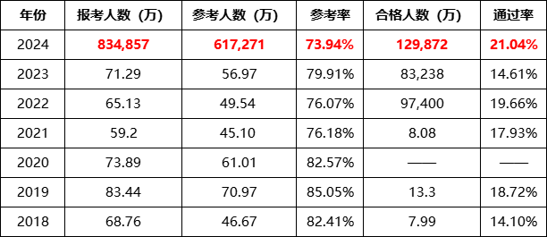 人力資源社會保障部人事考試中心數(shù)據(jù)顯示,2024年度執(zhí)業(yè)藥師職業(yè)資格考試共計834,857人報考,617,271人實際參考,參考率73.94%。其中,129,872人考試成績合格(合格標準為72分),合格率為21.04%。為近7年最高?。?!