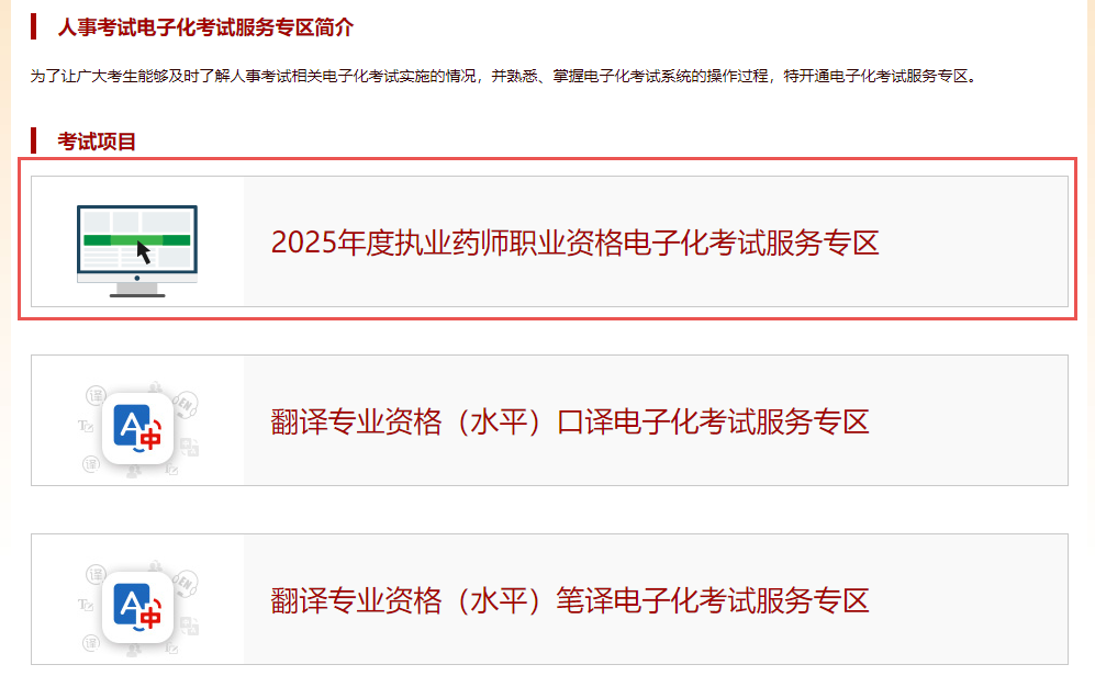 2、點擊“2025年度執(zhí)業(yè)藥師職業(yè)資格電子化考試服務(wù)專區(qū)”