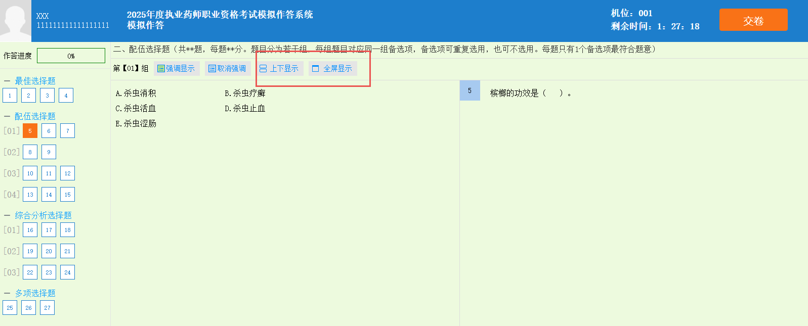 在配伍選擇題與綜合分析選擇題界面中,試題欄默認(rèn)左右分欄,可以切換上下顯示、全屏顯示。