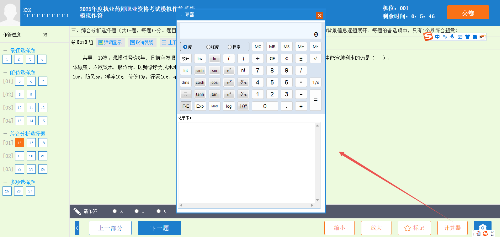 機考系統(tǒng)內(nèi)置計算器功能,操作方法與Windows系統(tǒng)自帶的計算器類似。應(yīng)試人員可以根據(jù)自身需要,在計算器界面下方的記事本區(qū)域輸入文字或字符,其功用相當(dāng)于“電子草稿紙”;使用鍵盤中的Ctrl+Shift組合鍵可以切換輸入法。