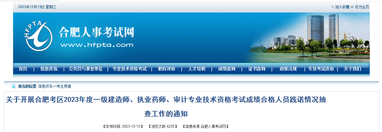 根據(jù)省人社廳《關(guān)于專業(yè)技術(shù)人員資格考試告知承諾制試點(diǎn)工作有關(guān)事宜的通知》(皖人社秘〔2020〕41 號(hào)) 以及資格考試報(bào)名證明事項(xiàng)告知承諾制有關(guān)要求,擬于近期開展合肥考區(qū)2023年度一級(jí)建造師資格、執(zhí)業(yè)藥師職業(yè)資格、審計(jì)專業(yè)技術(shù)資格考試成績(jī)合格人員踐諾情況抽查工作,現(xiàn)將有關(guān)情況通知如下。