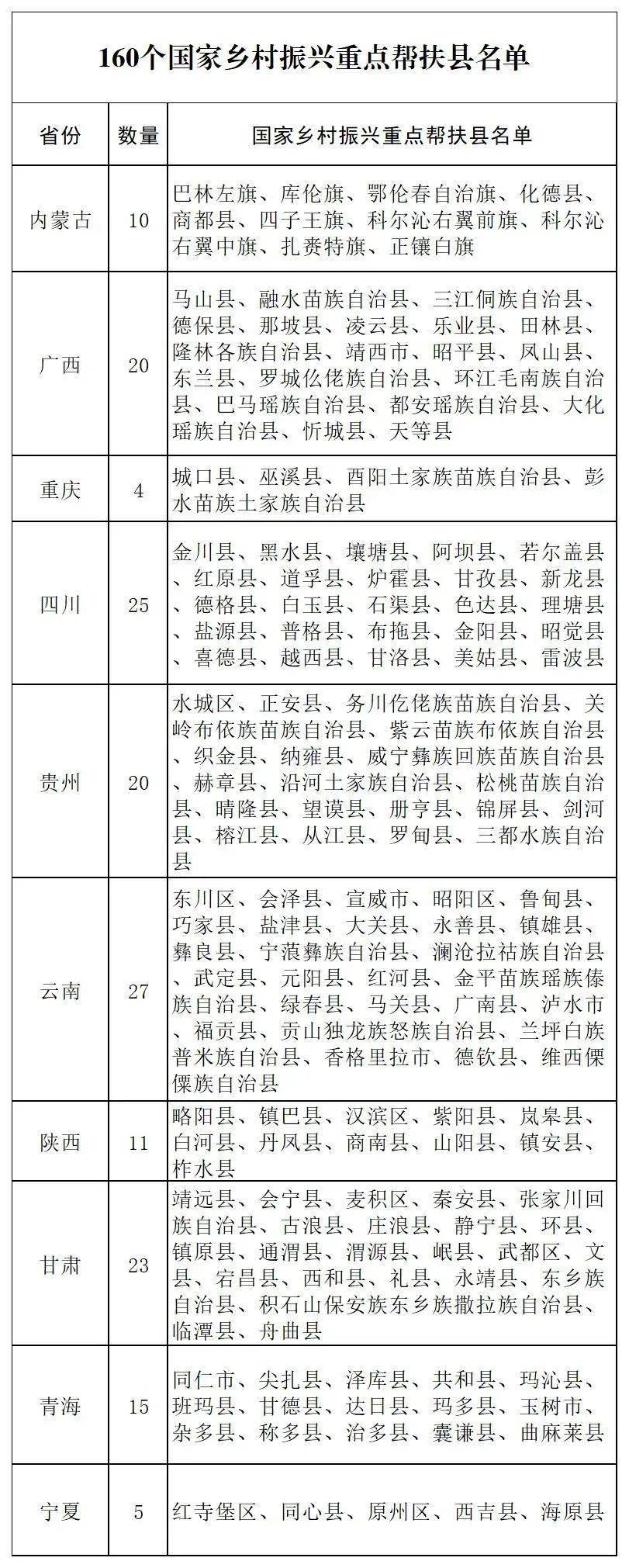 160個國家鄉(xiāng)村振興重點幫扶縣、西藏自治區(qū)、四省涉藏州縣、新疆維吾爾自治區(qū)南疆四地州、甘肅臨夏州、四川涼山州、樂山市峨邊縣、馬邊縣及金口河區(qū)。