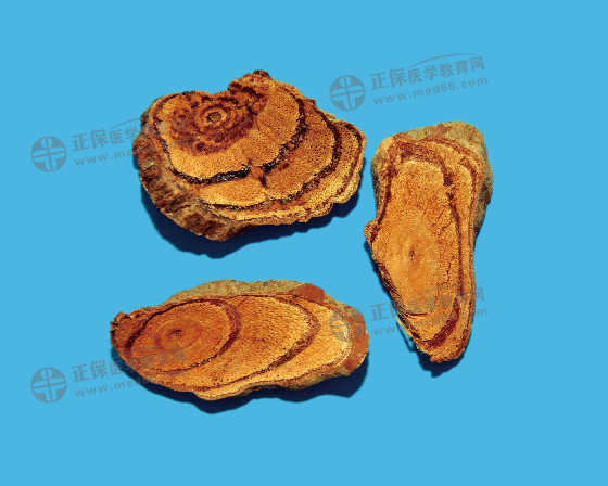 呈橢圓形、長矩圓形或不規(guī)則的斜切片。栓皮灰棕色,有的可見灰白色斑塊,栓皮脫落處顯紅棕色。質(zhì)堅硬。切面木部紅棕色或棕色,導管孔多數(shù);韌皮部有樹脂狀分泌物呈紅棕色至黑棕色,與木部相間排列呈數(shù)個同心性橢圓形環(huán)或偏心性半圓形環(huán);髓部偏向一側(cè)。氣微,味澀。