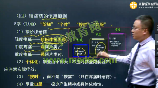考點(diǎn)5. 鎮(zhèn)痛藥的合理用藥原則,包括:盡可能選口服給藥:“按時(shí)”給藥,而不是“按需”給藥;用藥劑量個(gè)體化,根據(jù)患者需要由小劑量開(kāi)始,逐漸加大劑量;阿片類(lèi)藥物劑量一般不存在天花板效應(yīng)。