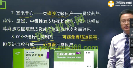 考點(diǎn)6. 因抑制血管內(nèi)皮的前列腺素生成,使血管內(nèi)的前列腺素和血小板中的血栓素動(dòng)態(tài)失衡失調(diào)而致血栓形成風(fēng)險(xiǎn)增加的非甾體抗炎藥物是塞來(lái)昔布。