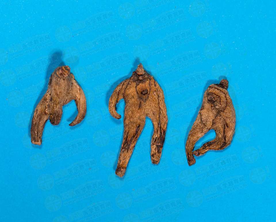 藥材呈不規(guī)則扁圓形,多有2~3個(gè)爪狀分枝,少數(shù)具4~5個(gè)爪狀分枝。表面灰白色至灰棕色,或黃白色,有數(shù)圈同心環(huán)節(jié)和棕色點(diǎn)狀須根痕,上面有突起的莖痕,下面有連接另一塊莖的痕跡。質(zhì)堅(jiān)硬,不易折斷,切面類白色,角質(zhì)樣。氣微,味苦,嚼之有黏性。