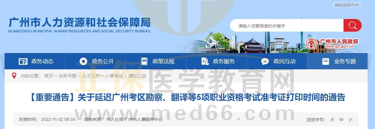 廣東廣州人力資源和社會保障局發(fā)布了《【重要通告】關(guān)于延遲廣州考區(qū)勘察、翻譯等5項(xiàng)職業(yè)資格考試準(zhǔn)考證打印時間的通告》,具體通知內(nèi)容如下:
