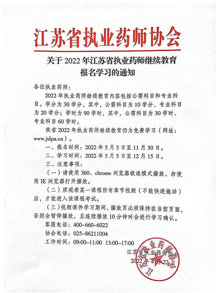 江蘇藥師協(xié)會發(fā)布了《關于2022年江蘇省執(zhí)業(yè)藥師繼續(xù)教育報名學習的通知》的相關內容:具體如下: