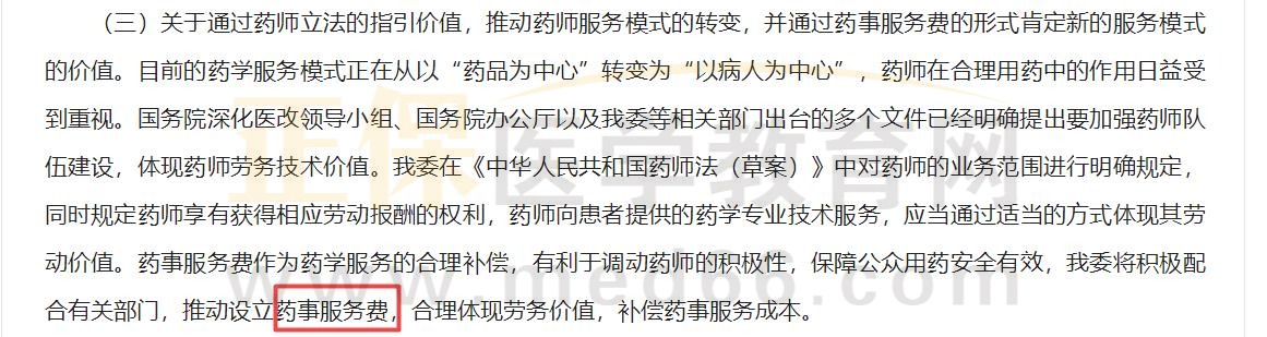 2022年7月15日,國家衛(wèi)健委對十三屆全國人大關(guān)于加速藥師法立法進(jìn)程的建議作出回應(yīng) ,“我委在《中華人民共和國藥師法(草案)》中對藥師的業(yè)務(wù)范圍進(jìn)行明確規(guī)定,同時(shí)規(guī)定藥師享有獲得相應(yīng)勞動(dòng)報(bào)酬的權(quán)利,藥師向患者提供的藥學(xué)專業(yè)技術(shù)服務(wù),應(yīng)當(dāng)通過適當(dāng)?shù)姆绞襟w現(xiàn)其勞動(dòng)價(jià)值。藥事服務(wù)費(fèi)作為藥學(xué)服務(wù)的合理補(bǔ)償,有利于調(diào)動(dòng)藥師的積極性,保障公眾用藥安全有效,我委將積極配合有關(guān)部門,推動(dòng)設(shè)立藥事服務(wù)費(fèi),合理體現(xiàn)勞務(wù)價(jià)值,補(bǔ)償藥事服務(wù)成本?!?/p>
