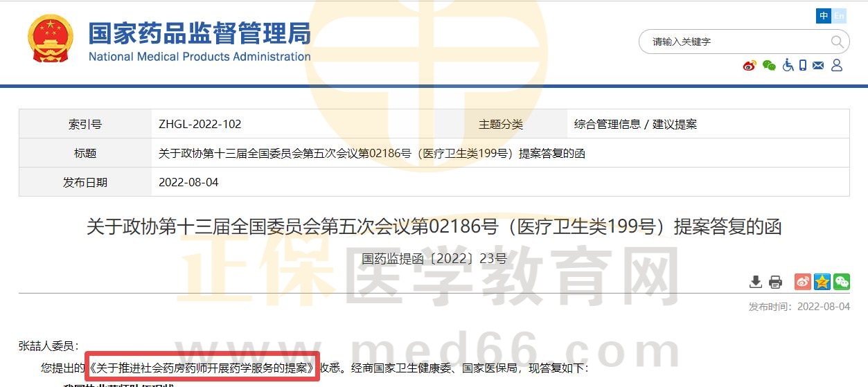 2022年8月4日,國家藥監(jiān)局對政協(xié)十三屆全國委員會(huì)關(guān)于推進(jìn)社會(huì)藥房藥師開展藥學(xué)服務(wù)的提案作出了明確回復(fù):國家藥監(jiān)局將進(jìn)一步加強(qiáng)工作調(diào)研,及時(shí)總結(jié)地方的實(shí)踐經(jīng)驗(yàn),探索制定并適時(shí)出臺(tái)社會(huì)藥店開展藥學(xué)服務(wù)的實(shí)施規(guī)范,同主管部門探討醫(yī)保支付藥店藥品調(diào)劑費(fèi)、藥學(xué)服務(wù)費(fèi)等工作,同時(shí)積極推動(dòng)執(zhí)業(yè)藥師回歸藥學(xué)服務(wù)本職,為人民提供高質(zhì)量的藥學(xué)服務(wù)。