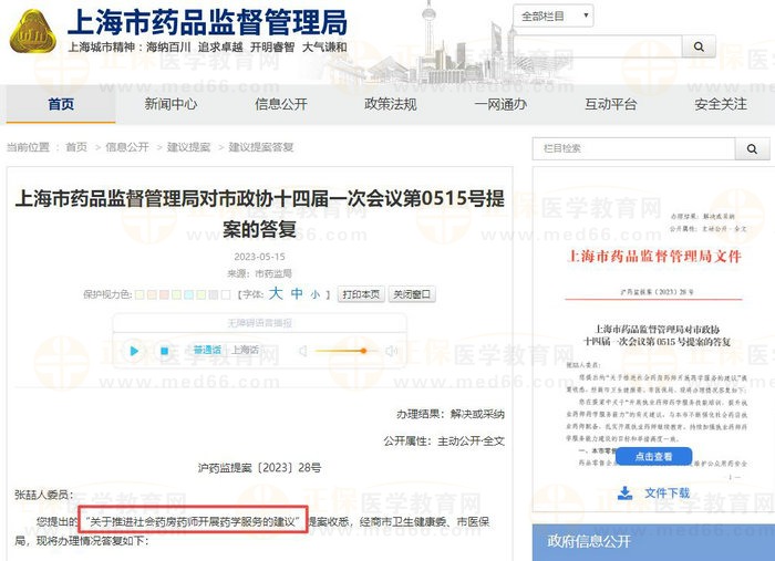 2023年5月15日,上海市藥品監(jiān)督管理局發(fā)布了《上海市藥品監(jiān)督管理局對(duì)市政協(xié)十四屆一次會(huì)議第0515號(hào)提案的答復(fù)》,事關(guān)執(zhí)業(yè)藥師藥學(xué)服務(wù)工作的落實(shí)和開展!快來一起了解一下吧!