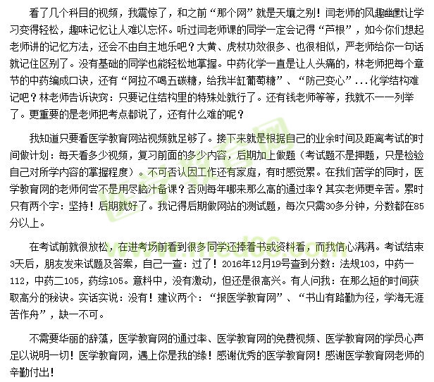 2016年5月朋友讓我考藥師證,并說:“那么多人都考過了,對你來說還不是小兒科?”我是不怕考試的,關(guān)鍵是考了有何用?朋友笑了:“只需很少投入,外加精力和時間,來年的利潤近10倍。這生意你做不做?”就這樣在朋友的鼓動下我決定考試了。那時自信的我以為買書自己看即可。于是在網(wǎng)上買書,附有另一網(wǎng)站老師的視頻??戳?個多月,開始心慌了:“法規(guī)”老師不過是照著課本念一遍;中藥化學(xué)聽了和沒聽差不多;藥劑太雜沒有重點;中藥鑒定內(nèi)容太多不可能將所有記住;藥綜、藥二能懂,但難以記住。聯(lián)系朋友:“考霸沒信心了!生意不想做了。”朋友了解后告訴我:“醫(yī)學(xué)教育網(wǎng)!”之前我并不了解醫(yī)學(xué)教育網(wǎng),也不知道身邊很多人在醫(yī)學(xué)教育網(wǎng)學(xué)習(xí)。