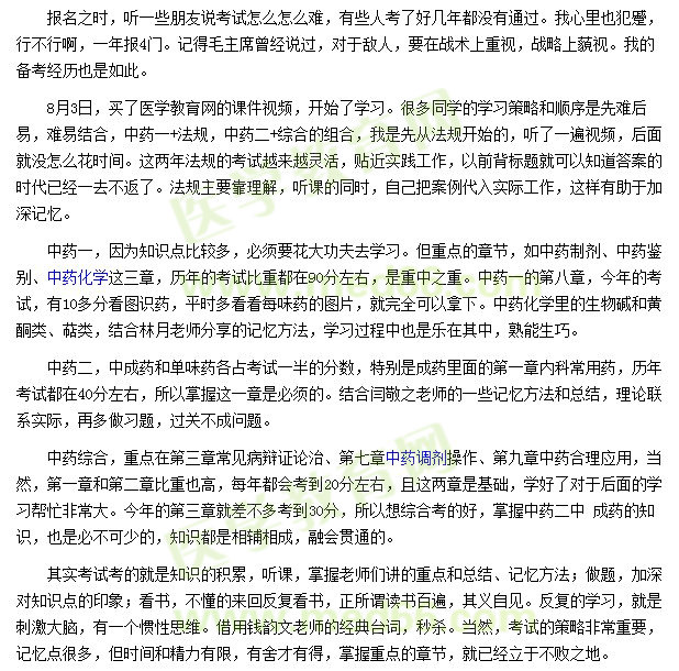 醫(yī)學(xué)教育網(wǎng)推出了2016年我的執(zhí)業(yè)藥師智力大型有獎(jiǎng)?wù)魑幕顒?dòng),醫(yī)學(xué)教育網(wǎng)學(xué)員爭(zhēng)先恐后的參加活動(dòng)。為了給我們帶來(lái)精彩的文章,醫(yī)學(xué)教育網(wǎng)執(zhí)業(yè)藥師學(xué)員zwb812根據(jù)自己參加2016年執(zhí)業(yè)中藥師的經(jīng)歷寫了這篇:《2016中藥執(zhí)考點(diǎn)滴經(jīng)驗(yàn)分享》,讓我們一起來(lái)見(jiàn)證他的執(zhí)業(yè)藥師之路吧!