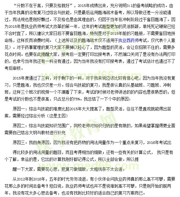 上述幾句話是我2015年-2016年備考執(zhí)業(yè)藥師的真實寫照,日常生活的三點一線,工作、家庭、孩子,還多了醫(yī)學(xué)教育網(wǎng)老師們的陪伴,感謝老師們的辛勤付出與孜孜不倦的教誨。