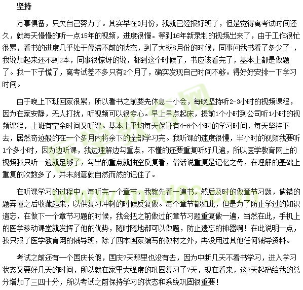 既然決定要考,不管多困難都要克服,開始慢慢準(zhǔn)備。記得有一句話叫:平臺(tái)不對(duì),努力白費(fèi)!所以在選擇學(xué)習(xí)平臺(tái)的時(shí)候我糾結(jié)了好久,實(shí)體班?網(wǎng)絡(luò)視頻班?最后我選擇了網(wǎng)絡(luò)視頻,因?yàn)榭梢灾貜?fù)觀看里面的視頻,有聽不懂的地方可以多聽?zhēng)妆?。相比較了幾個(gè)網(wǎng)絡(luò)教育平臺(tái),最終選擇醫(yī)學(xué)教育網(wǎng),因?yàn)獒t(yī)學(xué)教育網(wǎng)無(wú)論在師資實(shí)力上,還是在聲望和知名度上,據(jù)我了解都是領(lǐng)先的。