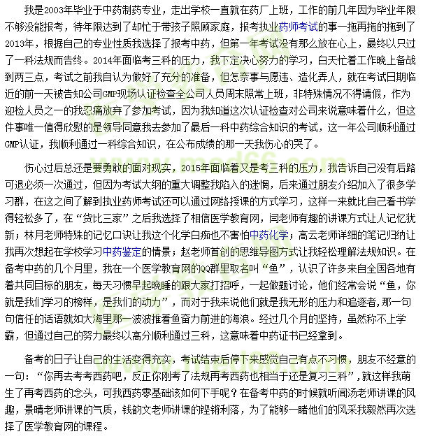 在2016年我的執(zhí)業(yè)藥師之路大型征文活動中,醫(yī)學(xué)教育網(wǎng)學(xué)員積極參與,為我們帶來了很多精彩的文章,網(wǎng)校執(zhí)業(yè)藥師學(xué)員7718****根據(jù)自己參加2016年執(zhí)業(yè)藥師考試的經(jīng)歷編寫了這篇:《我的執(zhí)業(yè)藥師之路—你就是我的奇跡,感謝你成就了我的雙證夢!》,此篇文章在征文比賽中獲得了優(yōu)秀獎的好成績,讓我們一起來見證他(她)的醫(yī)考之路吧!
