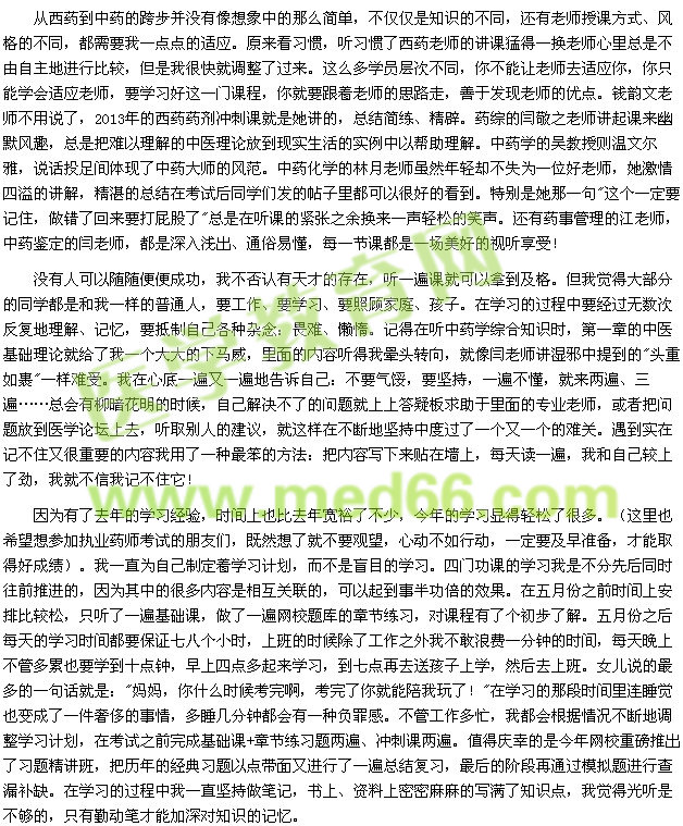 2013年在離考試還有最后整整兩個(gè)月時(shí),在我的學(xué)習(xí)陷入迷茫、無(wú)助的時(shí)候,經(jīng)朋友的介紹想到借助網(wǎng)絡(luò)學(xué)習(xí),經(jīng)過(guò)幾家網(wǎng)站比較,最終認(rèn)定了她——醫(yī)學(xué)教育網(wǎng)。經(jīng)過(guò)網(wǎng)校老師兩個(gè)月培訓(xùn)學(xué)習(xí),2013年的最后一天她給了我一個(gè)天大的驚喜:在執(zhí)業(yè)西藥師中以專業(yè)知識(shí)一90分、專業(yè)知識(shí)二77分、藥事管理84分、藥學(xué)綜合83分的成績(jī)一次通過(guò)了四門(mén)!這是我報(bào)考執(zhí)業(yè)藥師四年來(lái)給我的最大驚喜,激動(dòng)之余,我寫(xiě)下了《成功等于正確的堅(jiān)持》一文,并獲得了二等獎(jiǎng)。她給我的不僅僅是一本證書(shū),更是對(duì)自己能力的肯定;她教給我的不只是執(zhí)業(yè)藥師的知識(shí),更是一種拼搏進(jìn)取的精神,一種對(duì)待學(xué)習(xí)、對(duì)待生活的態(tài)度!