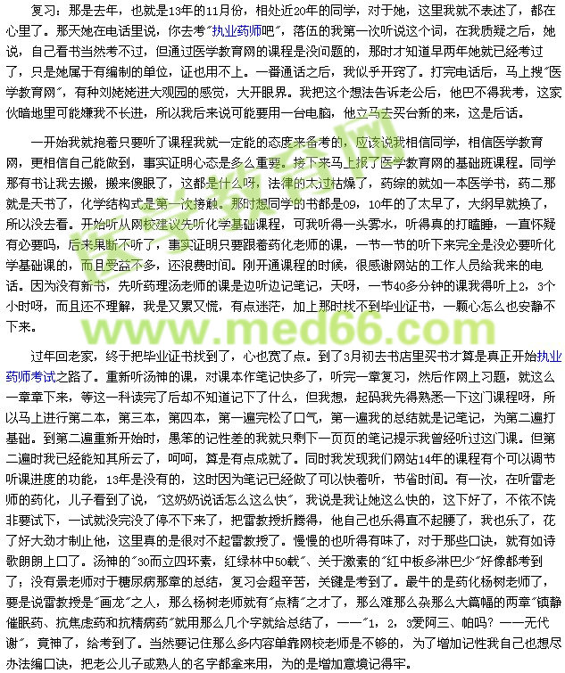 收獲:經(jīng)歷了兩月多焦慮的等待后,終于查到成績了,如愿以償,法律82,藥一84,藥二85,綜合86,很平均,真心的感謝醫(yī)學(xué)教育網(wǎng),也感謝我那位同學(xué),沒有你們不可能會有今天這結(jié)果。老公說我寫的是流水賬,是的,只有這流水賬才能讓我慢慢回味這一年的點(diǎn)滴,回味網(wǎng)校的學(xué)習(xí)生涯,我很眷念,甚至奢盼明年中專學(xué)歷還能考,那么我就能因執(zhí)業(yè)中藥師而和"醫(yī)學(xué)教育網(wǎng)"繼續(xù)結(jié)緣。