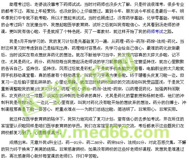 05年衛(wèi)校畢業(yè),在鄉(xiāng)下開拉個個人診所,09年考助理,沒有參加學習,自己看書,當年連技能都沒過。10年重新考的時候,偶爾在網上看到醫(yī)學教育網,就懷著試試看的目的試聽啦網校的課程,不聽不知道,一聽就叫我茅塞頓開,當時立馬決定要報個班。就這樣努力奮斗啦將近8個月,最后以221分順利通過啦助理考試,非常感謝網校。后來見朋友考醫(yī)師我都推薦網校的課程。