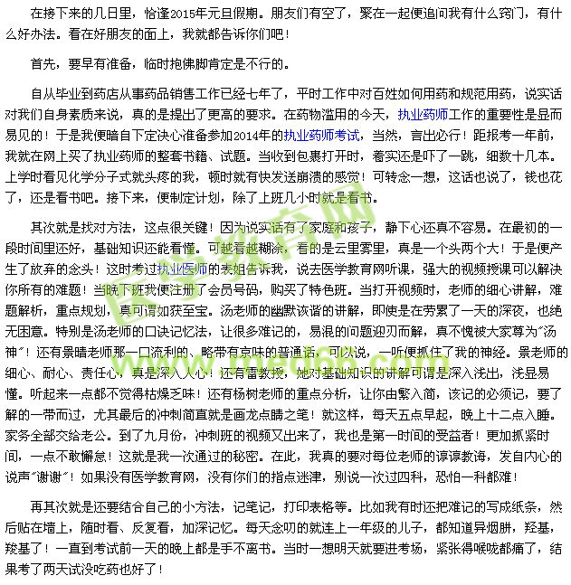 最后,我真的要告訴每位即將要參加考試的朋友,雖然說(shuō)"天道酬勤",但還要找對(duì)方法——只要是在醫(yī)學(xué)教育網(wǎng)的幫助下,通過(guò)執(zhí)業(yè)藥師的考試便不再難,你就一定能夢(mèng)想成真!