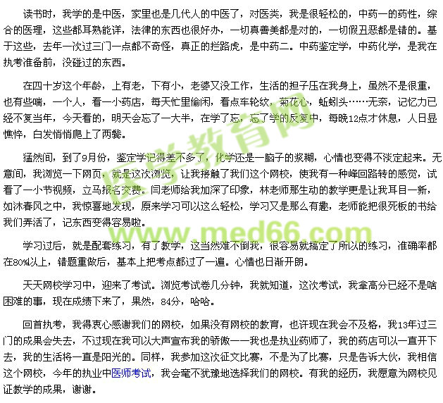 等待,只需要等待,我的執(zhí)業(yè)藥師證到手,我就是執(zhí)業(yè)助理醫(yī)師與執(zhí)業(yè)藥師雙能人才。考試過后,一切的激情都?xì)w與平靜,在好好地休息了許久之后的今天,回到網(wǎng)校來瀏覽,發(fā)現(xiàn)這個征文比賽,本著實事求是與對網(wǎng)校負(fù)責(zé)的態(tài)度,我來說說我的執(zhí)考之路。