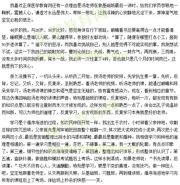 在此我非常想給后面志力于考執(zhí)業(yè)藥師的學(xué)員們一點(diǎn)建議:好的老師和自身的努力等于成功,堅(jiān)定不移地選擇正保醫(yī)學(xué)教育網(wǎng)吧!