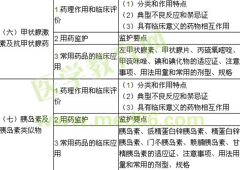 | (五)調(diào)節(jié)體內(nèi)激素平衡的藥物 | 1.藥理作用和臨床評價 | (1)分類和作用特點 (2)典型不良反應(yīng)和禁忌證 (3)具有臨床意義的藥物相互作用 |