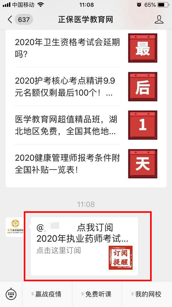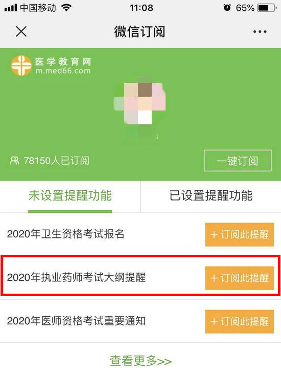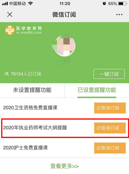 3. 找到「2020年執(zhí)業(yè)藥師考試大綱提醒」,點擊「訂閱此提醒」