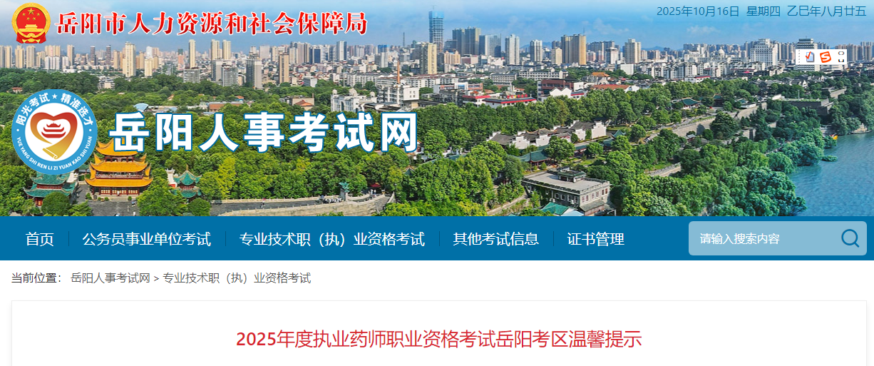 【湖南岳陽】2025年度執(zhí)業(yè)藥師職業(yè)資格考試岳陽考區(qū)溫馨提示