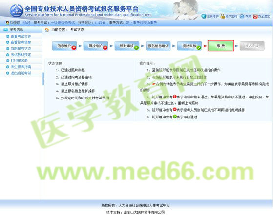 報考人員打印報名表后,需要按照各地考試機構(gòu)的規(guī)定到指定審核點進(jìn)行資格審查。經(jīng)審核,符合報考條件的報考人員再次登錄網(wǎng)站查看報考狀態(tài),如狀態(tài)顯示審核通過,報考人員即可按規(guī)定時間繳納考試費用(見下圖)。