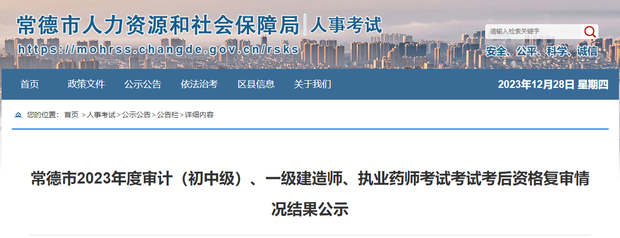 【湖南常德】2023年審計(jì)(初中級)、一級建造師、執(zhí)業(yè)藥師考試考后資格復(fù)審情況結(jié)果公示