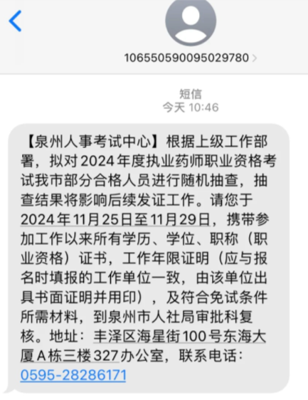 【泉州人事考試中心】根據(jù)上級工作部署,擬對2024年度執(zhí)業(yè)藥師職業(yè)資格考試我市部分合格人員進(jìn)行隨機抽查,抽查結(jié)果將影響后續(xù)發(fā)證工作。請您于2024年11月25日至11月29日,攜帶參加工作以來所有學(xué)歷、學(xué)位、職稱(職業(yè)資格)證書,工作年限證明(應(yīng)與報名時填報的工作單位一致,由該單位出具書面證明并用印),及符合免試條件所需材料,到泉州市人社局審批科復(fù)核。