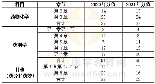 2021年執(zhí)業(yè)藥師《藥學(xué)專業(yè)知識(一)》分為三大塊:藥劑學(xué)、藥物化學(xué)、其他(藥分和藥效學(xué))。各部分分值沒有很大的變化,藥劑學(xué)部分55分,占比稍有增加,藥物化學(xué)部分37分,較去年基本持平,藥分和藥效學(xué)部分28分,有所下降。具體各部分分值比例如下圖: