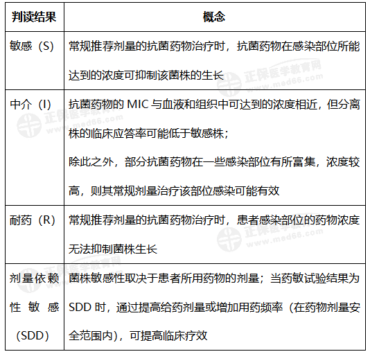 【解析】 結果判讀:包括敏感(susceptible, S)、 耐藥(resistant, R)、中介(intermediate, I)、 劑量依賴性敏感(susceptible - dose dependent, SDD)。其中“敏感”指常規(guī)推薦劑量的抗菌藥物治療時,抗菌藥物在感染部位所能達到的濃度可抑制該菌株的生長。