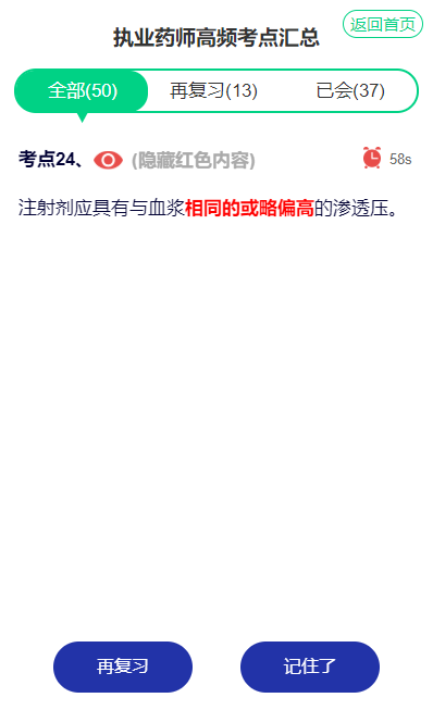 4、已經完全記憶的知識點,點擊“記住了”;需要再次記憶的知識點,點擊“在復習”;系統(tǒng)將根據考生選擇,將兩類知識點分開,考生可自行選擇,繼續(xù)刷“再復習”的知識點。