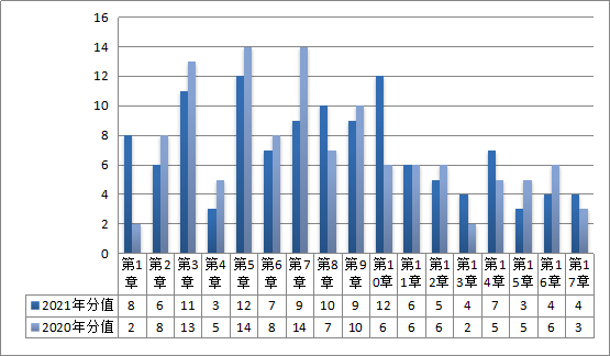 從2021年的考試題目可以看出,17個章節(jié)的分值相比以前更均勻了,沒有出現(xiàn)20分以上的章節(jié),也沒有出現(xiàn)1分甚至0分的章節(jié),我們可以分為三個檔次“10分及以上章節(jié)”“5~10分章節(jié)”“5分及以下章節(jié)”。