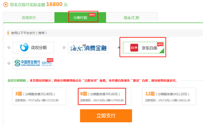 第四步:在支付頁(yè)面,選擇分期付款-京東白條進(jìn)行支付,分期期數(shù)一定要選擇6期哦!