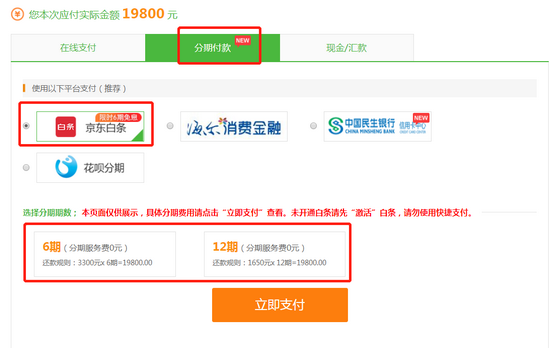 第三步:在支付頁(yè)面,選擇分期付款-京東白條進(jìn)行支付,選擇6期或12期!,切記,一定要選擇京東白條!