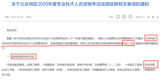 官方文件明確說到:北京地區(qū)2020年未組織報名的考試,此前取得過合格成績且2020年未在其他?。▍^(qū)、市)參考的北京考區(qū)人員,其已經(jīng)取得的合格成績有效期相應延長一年。