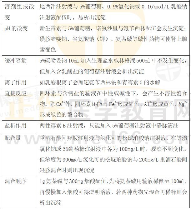 【解析】本題主要考查注射劑配伍變化的主要原因。注射劑配伍變化的主要原因有:溶劑組成改變、pH改變、緩沖容量、離子作用、直接反應(yīng)、鹽析作用、配合量、混合的順序、反應(yīng)時(shí)間、氧與二氧化碳的影響、光敏感性和成分的純度。