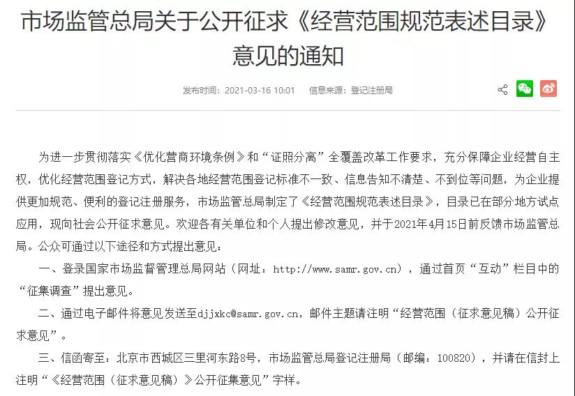 此前,市場(chǎng)總局公布的《關(guān)于全面開(kāi)展經(jīng)營(yíng)范圍登記規(guī)范化工作的通知(征求意見(jiàn)稿)》(以下簡(jiǎn)稱(chēng)《通知》)就談到,要全面使用經(jīng)營(yíng)范圍登記規(guī)范目錄,優(yōu)化經(jīng)營(yíng)范圍登記方式。