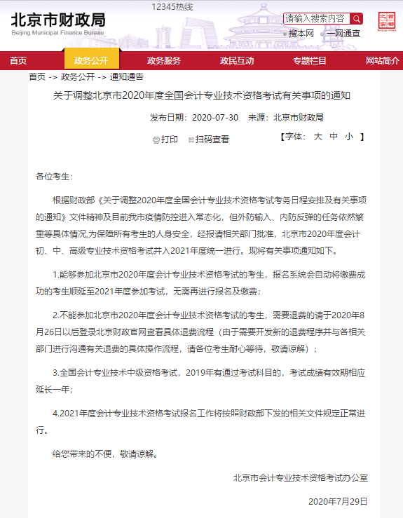 【官方通知:北京2020會計專業(yè)技術(shù)資格考試延期通知】