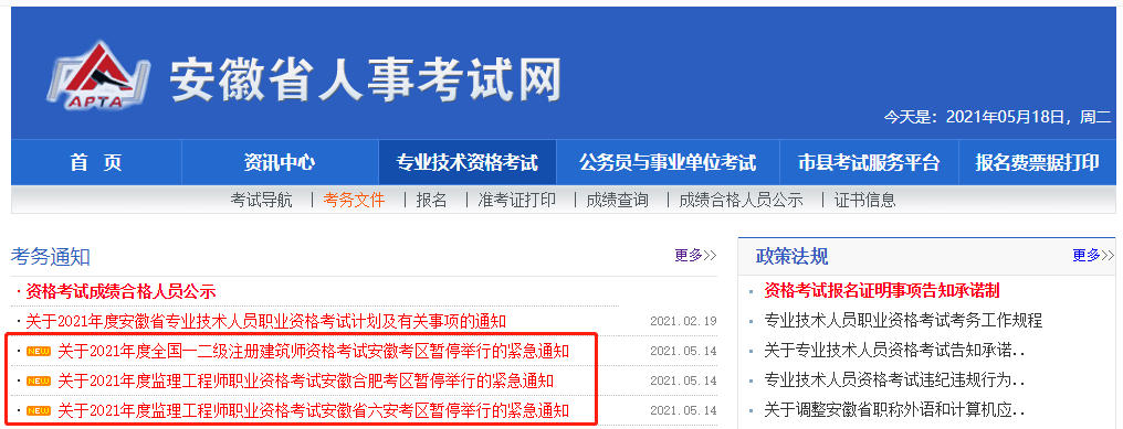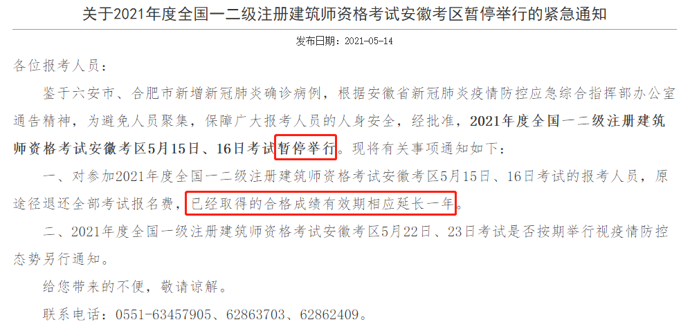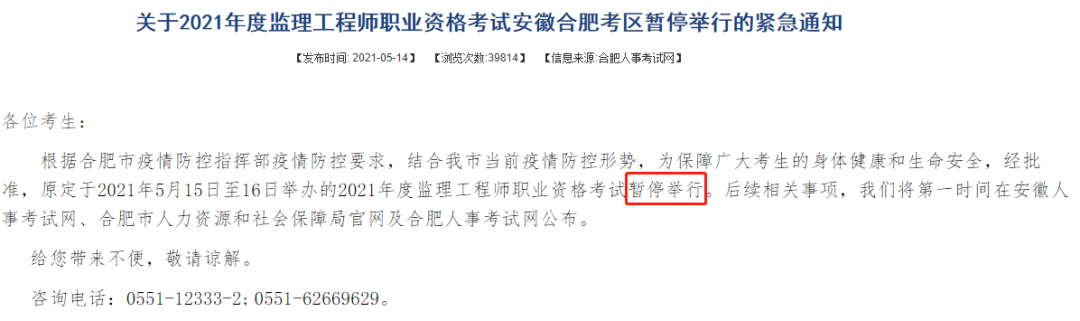 根據(jù)安徽省人事考試網(wǎng)近期緊急通知,鑒于安徽省六合區(qū)、合肥市的疫情影響,安徽考區(qū)的2021年度全國一二級注冊建筑師資格考試、六安考區(qū)和合肥考區(qū)的2021年度監(jiān)理工程師職業(yè)資格考試全部暫停考試。