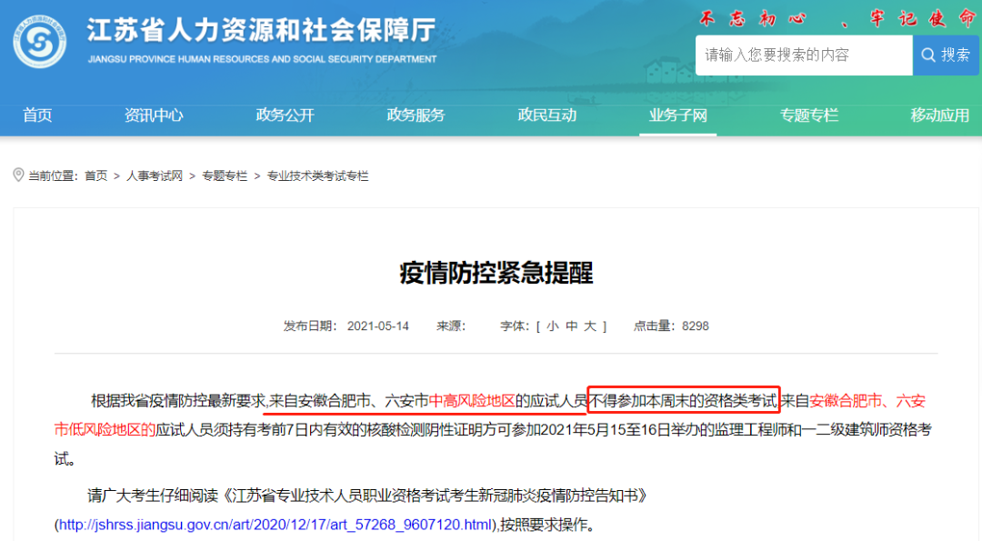 不僅是安徽省內(nèi)的部分考試停考或延期,還有其他省區(qū)對來自安徽省內(nèi)的考生做了限制。比如江蘇省限制了來自安徽合肥市、六安市中高風險地區(qū)的應試人員參與本省的近期考試: