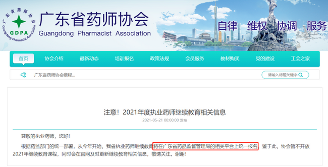 根據(jù)廣東省藥師協(xié)會(huì)官網(wǎng)通知:根據(jù)藥監(jiān)部門的統(tǒng)一部署,從2021年開始,廣東省執(zhí)業(yè)藥師繼續(xù)教育將在廣東省藥品監(jiān)督管理局的相關(guān)平臺(tái)上統(tǒng)一報(bào)名。鑒于此,協(xié)會(huì)暫不開放2021年繼續(xù)教育課程,同時(shí)會(huì)在官網(wǎng)及時(shí)更新繼續(xù)教育相關(guān)信息。