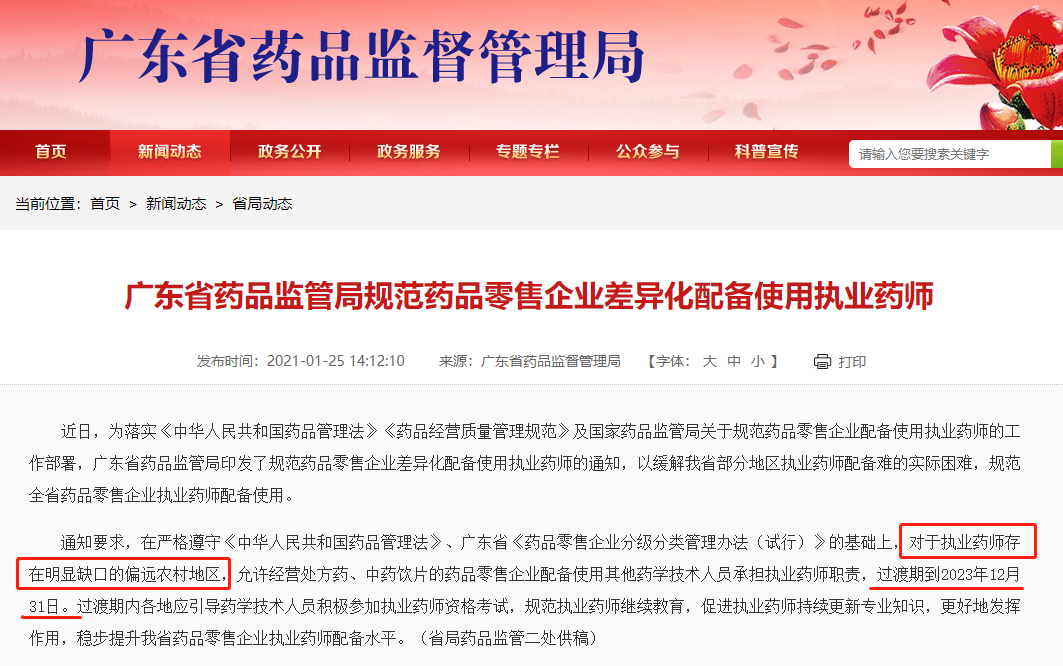 廣東省藥監(jiān)局印發(fā)通知,明確在執(zhí)業(yè)藥師存在明顯缺口的偏遠(yuǎn)農(nóng)村地區(qū),經(jīng)營處方藥、中藥飲片的藥品零售企業(yè),允許其配備使用其他藥學(xué)技術(shù)人員承擔(dān)執(zhí)業(yè)藥師職責(zé),過渡期到2023年12月31日。