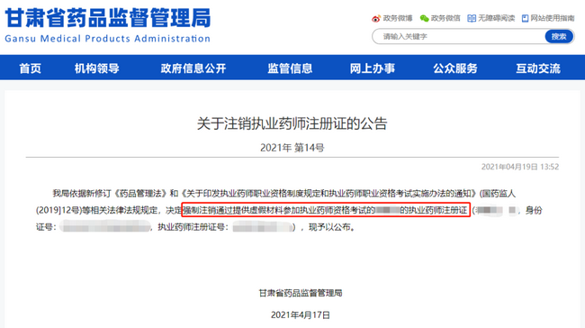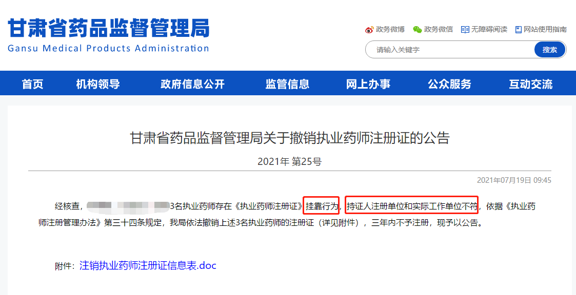 7月19日甘肅省藥監(jiān)局發(fā)布了一則公告,內(nèi)容是三位執(zhí)業(yè)藥師存在行為,持證人注冊(cè)單位和實(shí)際工作單位不符,因此撤銷注冊(cè)證,并且三年內(nèi)不予注冊(cè)。此前,甘肅省藥監(jiān)局還發(fā)布一人因虛假報(bào)考而強(qiáng)制注銷一位執(zhí)業(yè)藥師的注冊(cè)證的通知。由此引起了很多考生一陣驚慌,怎么考試通過成績也不一定有效?怎么即使沒有掛證,但還是可能被注銷證書?