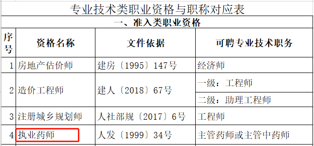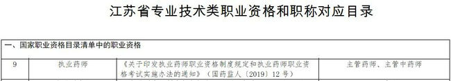 江蘇省省人社廳公布《江蘇省專業(yè)技術(shù)類職業(yè)資格和職稱對應(yīng)目錄》(蘇人社發(fā)〔2019〕93號),打通了職業(yè)資格和職稱的對應(yīng)通道。執(zhí)業(yè)藥師資格相當于主管藥師、主管中藥師。