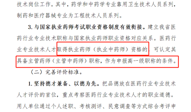 2019年4月份,廣東人社廳和廣東藥監(jiān)局聯(lián)合發(fā)布了《廣東省醫(yī)藥行業(yè)專業(yè)技術(shù)人才職稱評價改革實施方案》,而方案中也強調(diào)了醫(yī)藥行業(yè)專業(yè)技術(shù)人才取得執(zhí)業(yè)藥師(執(zhí)業(yè)中藥師)資格的,可認定其具備主管藥師(主管中藥師)職稱,作為申報高一級職稱的條件。