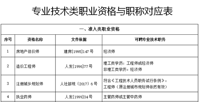 為促進職稱制度與職業(yè)資格制度有效銜接,減少重復(fù)評價,降低社會用人成本,現(xiàn)就建立部分專業(yè)技術(shù)職業(yè)資格和職稱對應(yīng)關(guān)系做出通知。專業(yè)技術(shù)人員取得專業(yè)技術(shù)類所列職業(yè)資格,即可認定其具備相應(yīng)系列和層級的職稱,并可據(jù)此作為申報高一級職稱的條件。
